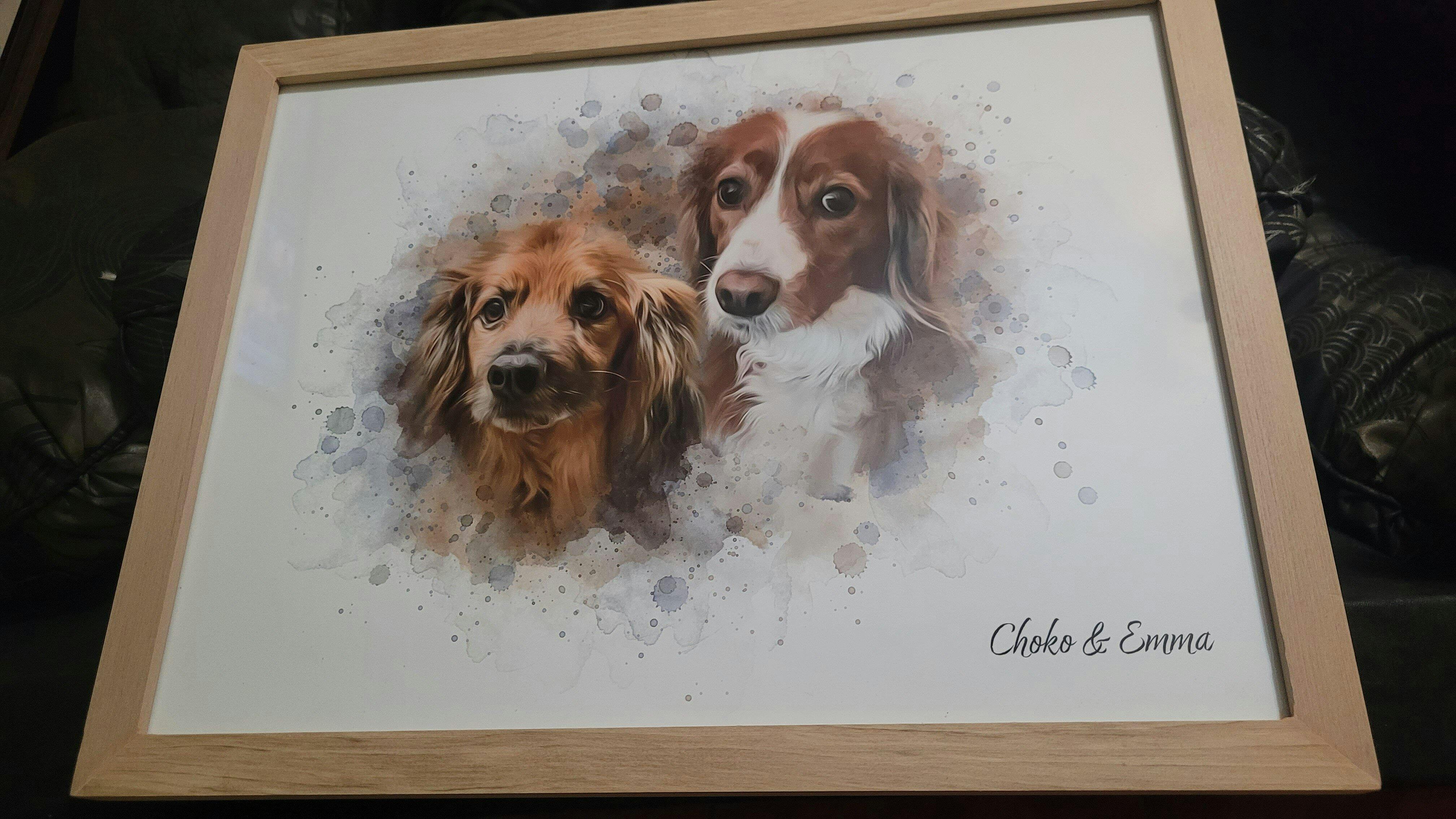 Convierte la esencia de tu mascota en un retrato lleno de vida y emoción. El estilo Watercolor destaca por sus trazos suaves y delicados, logrando una obra que transmite calidez y ternura en cada detalle. Una pieza única para decorar tu hogar con amor.